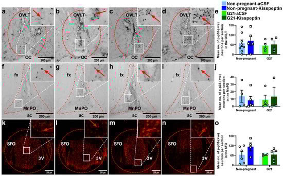 Examples of p-p38 labelling in the OVLT, MnPO and SFO of non-pregnant and G21 rats are shown in Figure 8a–d,f–i,k–n. Similarly to pERK1/2, there was no effect of reproductive status or ICV kisspeptin on the number of p-p38-positive OVLT neurons in non-pregnant (aCSF-treated, n = 8, kisspeptin-treated, n = 5) and G21 rats (aCSF-treated, n = 4, kisspeptin-treated, n = 4) (RS: F(1,1) = 0.601, p = 0.448; T: F(1,1) = 0.231, p = 0.636; RS × T: F(1,2) = 0.019, p = 0.890; Figure 8e), MnPO neurons in non-pregnant (aCSF-treated, n = 4, kisspeptin-treated, n = 5) and G21 rats (aCSF-treated, n = 4, kisspeptin-treated, n = 3) (RS: F(1,1) = 0.00007, p = 0.993; T: F(1,1) = 0.003, p = 0.952; RS × T: F(1,2) = 0.408, p = 0.534; Figure 8j) or SFO neurons in non-pregnant (aCSF-treated, n = 6, kisspeptin-treated, n = 4) and G21 rats (aCSF-treated, n = 3, kisspeptin-treated, n = 5) (RS: F(1,1) = 1.31, p = 0.271; T: F(1,1) = 1.50, p = 0.240; RS × T: F(1,2) = 1.32, p = 0.268, Figure 8o). Additionally, there was no correlation between p-p38 expression in oxytocin-positive SON neurons and pERK1/2-positive OVLT neurons (r = 0.112, p = 0.809), MnPO neurons (r = −0.648, p = 0.115) or SFO neurons (r = 0.189, p = 0.684) in G21 rats.