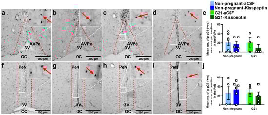 Examples of p-p38 labelling in the AVPe and PeN of non-pregnant and G21 rats are shown in Figure 10a–d,f–i. Similarly to pERK1/2, there was no effect of reproductive status or ICV kisspeptin on the number of p-p38-positive AVPe neurons in non-pregnant (aCSF-treated, n = 7, kisspeptin-treated, n = 5) and G21 rats (aCSF-treated, n = 3, kisspeptin-treated, n = 4) (RS: F(1,1) = 0.231, p = 0.637; T: F(1,1) = 0.882, p = 0.362; RS × T: F(1,2) = 0.225, p = 0.641; Figure 10e) or PeN neurons in non-pregnant (aCSF-treated, n = 4, kisspeptin-treated, n = 6) and G21 rats (aCSF-treated, n = 4, kisspeptin-treated, n = 4) (RS: F(1,1) = 0.455, p = 0.510; T: F(1,1) = 0.0008, p = 0.977; RS × T: F(1,2) = 0.559, p = 0.467; Figure 10j). Additionally, there was no correlation between p-p38 expression in oxytocin-positive SON neurons and pERK1/2-positive AVPe neurons (r = −0.378, p = 0.459) or PeN neurons (r = −0.178, p = 0.672) in G21 rats. There was insufficient tissue to label p-p38 in the ARC.