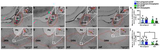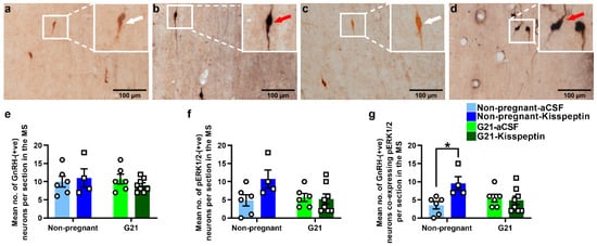 Activation of pERK1/2 by 2 µg ICV kisspeptin was confirmed by double labelling for GnRH and pERK1/2 in the MS. First, DAB staining of pERK1/2 was performed as described above, and sections were co-stained using guinea pig anti-GnRH primary antibody (GA02, a generous gift from Professor Allan Herbison; 1:10,000) with 4% normal goat serum for 48 h. Sections were then incubated in secondary antibody solution containing a goat anti-guinea pig (BA-1000, Vector Laboratories, Newark, CA, USA; 1:500). Finally, the DAB solution without nickel was added to label GnRH-expressing neurons. Examples of pERK1/2 and GnRH labelling in the MS of non-pregnant and G21 rats are shown in Scheme 2a–d. As expected, the proportion of GnRH neurons expressing pERK1/2 was significantly higher in kisspeptin-treated non-pregnant rats (90.15 ± 3.89%, n = 4) than in aCSF-treated non-pregnant rats (36.32 ± 11.5%, n = 6) but was not different between kisspeptin-treated late-pregnant rats (53.67 ± 11.1%, n = 8) and aCSF-treated late-pregnant rats (52.77 ± 9.05% n = 6) (RS: F(1,1) = 1.064, p = 0.314; T: F(1,1) = 4.461, p = 0.047; RS × T interaction: F(1,2) = 6.77, p = 0.017, two-way ANOVA; Scheme 2g), which was a similar outcome to our previous study using Fos protein as a marker of activation [].