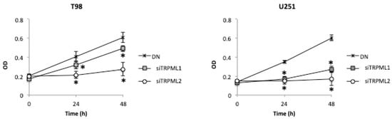 2.7. High Cell Growth Capability in DN Compared to siTRPML2 and siTRPML1 T98 and U251 Cells