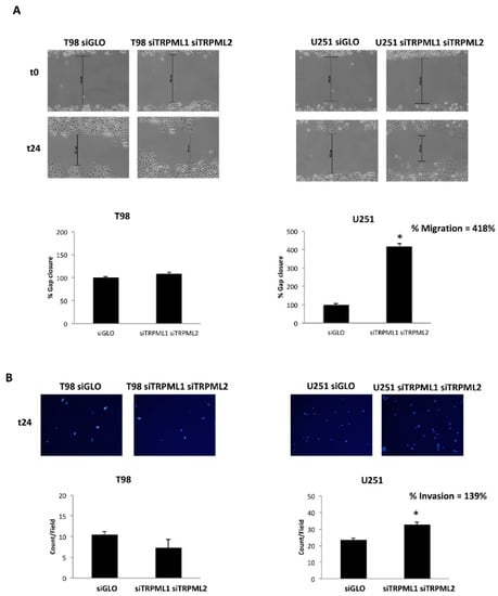 2.8. The TRPML1/TRPML2 Double Knockdown Increases the Migration/Invasion Capability in U251 GBM Cells