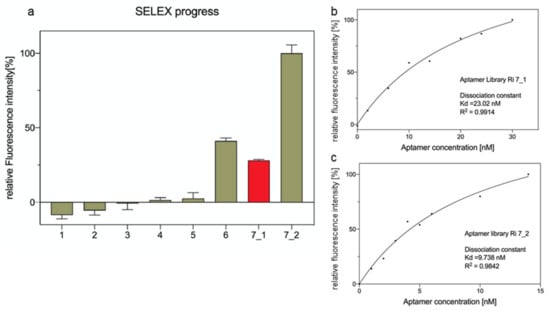 The FluCell-SELEX process was performed for seven rounds to obtain the functional library, which was able to recognize R. intestinalis. The labeling efficiency developed slowly with the respective libraries from round one to round five, being clearly below the detection limit, in the later stages of the SELEX it increased from round five to seven, while introducing counter-selection with mixtures of bacteria in round six. Interestingly, the labeling was impaired for the round seven library (designated as round 7_1 in Figure 2a) compared to round six. We thus tentatively attempted a modification of the counter-selection procedure, in a way that tenfold more unspecific target cells were offered in the alternative round 7_2. In fact, this led to a considerable increase in the R. intestinalis labeling and subsequently binding constants were determined. While a gradual increase in the fluorescence intensity was observed when fixed amounts of the R. intestinalis were co-incubated with different concentrations of the same aptamer library, the curve fitted with a typical one-site-specific binding model revealed that the aptamer library Ri 7_2 exhibited a reasonable low Kd value of 9.74 nM. In contrast, the dissociation constant of Ri 7_1 was only 23.02 nM, demonstrating a significantly improved sensitivity of the Ri 7_2 library, respectively (Figure 2b,c). Reducing (at a given and constant concentration of aptamers) the sequence space, and thus the amount of non-specific aptamers, increases at the same time the relative amount of specific aptamers in the library. This in turn leads to an increase in specificity and an increase in binding and the observed reduction in the dissociation constant Kd.
