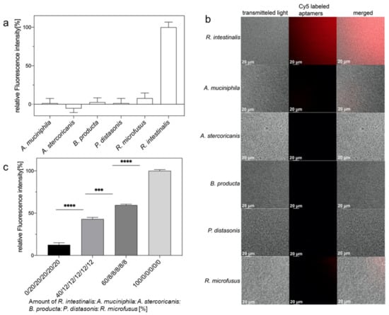 (a) Ri 7_2 specificity analysis of polyclonal aptamer library. The aptamer library was incubated with A. muciniphila, A. stercoricanis, B. producta, P. distasonis, R. microfusus and R. intestinalis, respectively. All experiments were performed with 108 cells and 5 pmol aptamers in triplicates (n = 3). Aptamers bound to R. intestinalis were significantly higher than the other five intestinal bacteria; (b) Fluorescence microscopy of the polyclonal aptamer library Ri 7_2 labeled with R. intestinalis. The binding of the Cy5-labeled polyclonal aptamer library to R. intestinalis showed the strongest fluorescent signal. The other five gut bacteria served as controls and only showed weak fluorescence signals; (c) Detection of increasing amounts of R. intestinalis by the fluorescent-labeled polyclonal aptamer library Ri 7_2 in a mixture of intestinal bacteria including A. muciniphila, A. stercoricanis, B. producta, P. distasonis and R. microfusus, which were adjusted in equal optical densities and mixed at different ratios. Scale bars represent 20 µm. All experiments were performed with 108 cells and 5 pmol aptamers in triplicates (n = 3). p values < 0.05 were considered significant. *** denotes p < 0.001 and **** p < 0.0001.