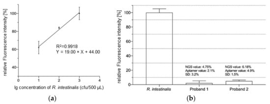 To further quantify the sensitivity of the aptamer library Ri 7_2 in the fluorometric assay, we successively reduced the number of R. intestinalis cells in the system and thus generated a calibration curve (Figure 4a). The concentration of R. intestinalis showed a significant linear relationship with the fluorescence intensity (R2 = 0.9918), when the number of bacteria in the 500 µL reaction system was varied from 101 to 103 CFU. The experimental detection limit of R. intestinalis for the aptamer library Ri 7_2 was 101 CFU. Thus, the high sensitivity of the aptamer library Ri 7_2 for identifying R. intestinalis also provides the possibility of detecting trace amounts of R. intestinalis in the fecal bacteria. Finally, to further validate the potential of the aptamer library Ri 7_2 for practical applications, we first obtained the exact amount of Roseburia in the feces of two healthy volunteers (proband 1 and proband 2 in Figure 4b) by 16S rRNA next-generation sequencing. We then used 500 µL samples containing 5 pmol of the aptamer library Ri 7_2 mixed with R. intestinalis (108 CFU) or fecal bacteria (108 CFU) for the binding assay. The relative fluorescence intensity of R. intestinalis as a control group was 100%. In contrast, the relative fluorescence intensity of the experimental group represented the relative abundance of Roseburia in the fecal bacteria. We obtained 4.75% and 6.18% for proband 1 and proband 2, respectively, of Roseburia in the fecal bacteria of the probands by NGS (see Tables S2 and S3, Supplementary Materials). The results originating from the fluorometric assay performed in parallel with the same samples were in the same range and, with 2.1% and 4.9%, reflected the higher cell number of R. intestinalis in the stool sample of proband 2 (Figure 4b). The standard deviations of these two datasets were 3.2% and 1.5%, respectively. Considering the possible experimental errors, it is reasonable to believe that the aptamer library Ri 7_2 is feasible and reliable for detecting the abundance of Roseburia in feces in practice.
