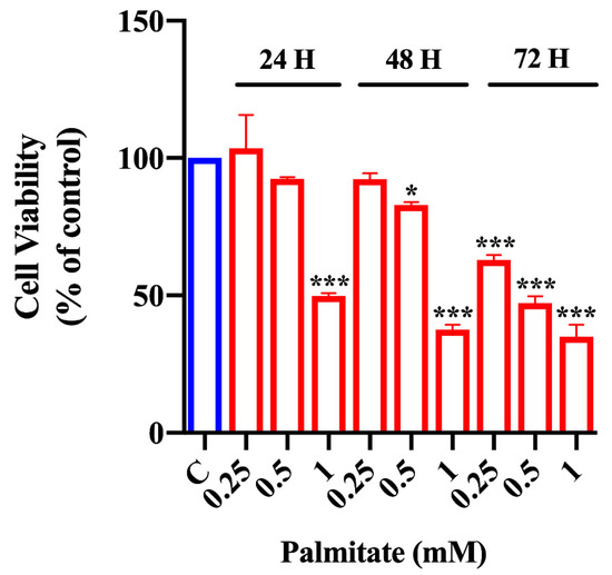 As shown in Figure 1, only the highest palmitate dose (1 mM) exerted a strong cytotoxic effect at 24 h. At 48 h of treatment, 0.25 mM palmitate did not alter cell viability, while 0.5 mM palmitate induced a minimal but significant reduction of cell viability with respect to control organoids. On the contrary, palmitate treatment for 72 h was toxic versus control organoids at all the analyzed concentrations. Statistical p values are reported in Table S1. Since 0.5 mM palmitate treatment for 48 h represented the lipotoxicity condition (cellular dysfunction before cell death pathway activation) better than the other observed concentrations, we chose this dose–time combination for subsequent experiments.