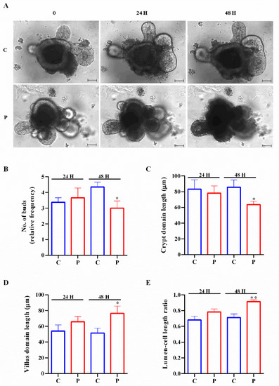 In order to analyze if palmitate treatment affected the growth of organoids, we compared the principal morphological characteristics of intestinal organoids treated with palmitate (0.5 mM) for different periods (24 and 48 h) compared to controls. The two types of organoids had differences in their general appearance during growth (Figure 2A). Organoids exposed to palmitate for 48 h showed a reducing trend in the proportion of budded palmitate-treated organoids (those with >3 buds) with respect to control organoids and a slightly decreased crypt domain length (Figure 2B,C). On the contrary, the villus domain length and the ratio between the lumen and cell length were increased after 48 h of exposure (Figure 2D,E). Statistical p values of organoid morphological features are shown in Table S2.