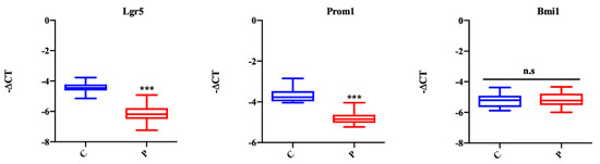 Influence of palmitate treatment on intestinal organoid proliferation. Lgr5, stem cells; Prom1, TA cells; Bmi1, +4 cells. Data generated from three biological replicates from five mice. Unpaired Student’s t test: *** p < 0.001; n.s. not significant. C, control; P, palmitate.