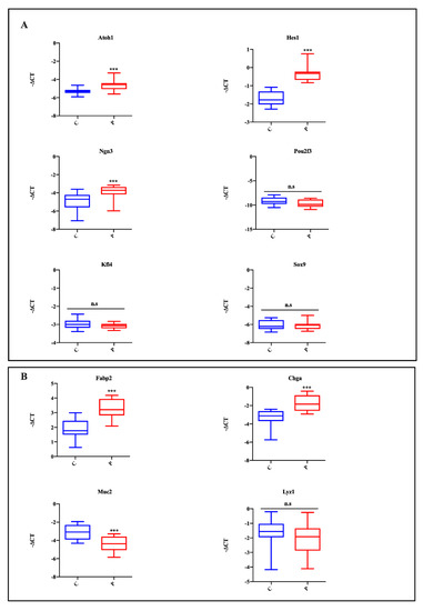 After chronic exposure to 0.5 mM palmitate, organoids were harvested by dissolving Matrigel with cold PBS. Total RNA was isolated from organoids through the RNeasy Mini Kit (Qiagen) following the manufacturer’s instructions. Total RNA was stored at −80 °C. RNA concentration was determined by spectrophotometric analysis (Nanodrop, Thermo Fisher Scientific, Rodano, MI, Italy). We performed quantitative real-time PCR by using Power SYBR® Green RNA-to-CT™ 1-Step Kit (Thermo Fisher Scientific, Rodano, MI, Italy) as previously reported [61,62]; beta-2-microglobulin (B2M) was used as the endogenous control gene. Gene expression dysregulation was determined through the 2−ΔΔCt method [63]. Quantitative real-time PCR was conducted on three biological replicates from five mice.