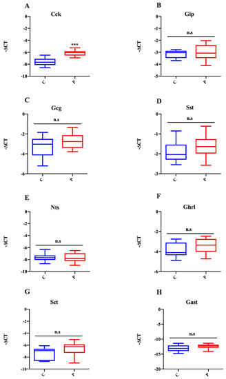 Action of palmitate exposure on EEC markers. Expression of CCK (A), Gip (B), Glp-1 (C), Sst (D), Nts (E), Ghrl (F), Sct (G) and Gast (H) in intestinal organoids treated with palmitate for 48 h. Data generated from three biological replicates from five mice. Unpaired Student’s t test: *** p < 0.001; n.s., not significant. C, control; P, palmitate.