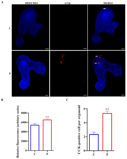Expression of CCK in small intestinal organoids. (A) Representative images of controls and organoids treated with palmitate for 48 h. CCK cells, inside organoids, are labeled in red by CCK expression (white arrows). Nuclei are labeled by Hoechst. Scale bar, 50 μm. (B) Quantification of the CCK fluorescence intensity. (C) CCK cell numbers in control organoids and organoids treated with palmitate. (n = 6). Data are expressed as means ± SD. Unpaired Student’s t test: ** p < 0.01. C, control; P, palmitate.