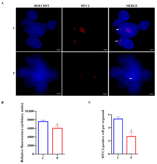 Expression of MUC2 in small intestinal organoids. (A) Representative images of controls and organoids treated with palmitate for 48 h. Goblet cells, inside organoids, are labeled in red by MUC2 expression (white arrows). Nuclei are labeled by Hoechst. Scale bar, 50 μm. (B) Quantification of the MUC2 fluorescence intensity. (C) MUC2 cell numbers in control organoids and organoids treated with palmitate. (n = 6). Data are expressed as means ± SD. Unpaired Student’s t test: * p < 0.05. C, control; P, palmitate.
