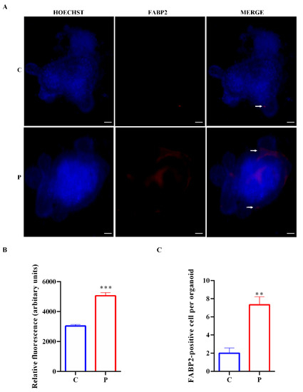 Expression of FABP2 in intestinal organoids. (A) Representative images of controls and organoids treated with palmitate for 48 h. Enterocytes, inside organoids, are labeled in red by FABP2 expression (white arrows). Nuclei are labeled by Hoechst. Scale bar, 50 μm. (B) Quantification of the FABP2 fluorescence intensity. (C) FABP2 cell numbers in control organoids and organoids treated with palmitate. (n = 6). Data are expressed as means ± SD. Unpaired Student’s t test: ** p < 0.01, *** p < 0.001. C, control; P, palmitate.