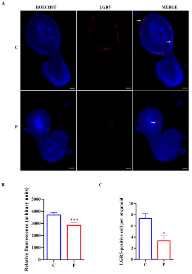 Expression of LGR5 in intestinal organoids. (A) Representative images of controls and organoids treated with palmitate for 48 h. Intestinal stem cells, inside organoids, are labeled in red by LGR5 expression (white arrows). Nuclei are labeled by Hoechst. Scale bar, 50 μm. (B) Quantification of the LGR5 fluorescence intensity. (C) LGR5 cell numbers in control organoids and organoids treated with palmitate. (n = 6). Data are expressed as means ± SD. Unpaired Student’s t test: * p < 0.05, *** p < 0.001. C, control; P, palmitate.
