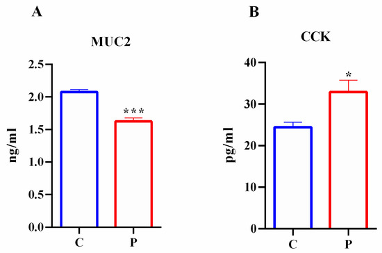 Effects of palmitate exposure on MUC2 and CCK production in intestinal organoids. MUC2 (A) and CCK (B) secretion from intestinal organoids treated with palmitate. (n = 3). Data are expressed as means ± SD. Unpaired Student’s t test: * p < 0.05, *** p < 0.001. C, control; P, palmitate.