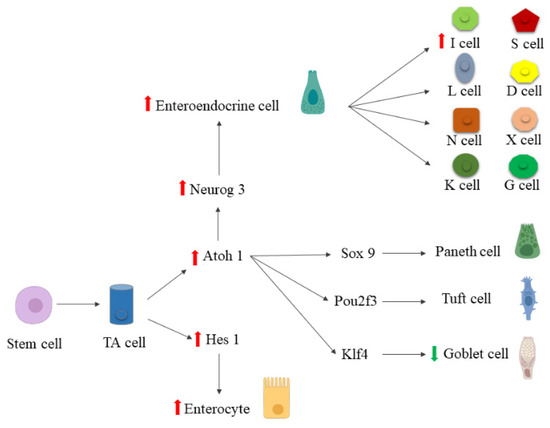 The intestinal epithelium is subjected to renewal every 4–5 days and is composed of terminally differentiated cells. The differentiation of intestinal cells is a continuous process strictly regulated in the gut; these cells arise from intestinal stem cells (ISCs) expressing leucine-rich repeats containing G-protein coupled receptor 5 (Lgr5) located in intestinal crypts that give rise to proliferating transit-amplifying cells (TA). Each of these cells can generate absorptive enterocytes and all secretory cell types such as goblet cells, Paneth cells, enteroendocrine cells (EECs) and tuft cells through the regulated expression of specific transcription factors (TFs). Hairy and enhancer of split-1 (Hes1) transcription factor is required for differentiation into absorptive enterocytes, while protein atonal homolog 1 (Atoh1) expression is involved in the determination of secretory cell fate. Kruppel-like factor 4 (Klf4) and Sox9 are required for goblet cell and Paneth cell differentiation, respectively. EECs require the transient expression of Neurogenin3 (Neurog3), while the development of Tuft cells requires the expression of the Pou domain, class 2, transcription factor 3 (Pou2f3) [9,10].