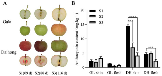 The phenotypes and anthocyanin contents of ‘Gala’ and ‘Daihong’ apples at different stages of growth. (A): Color changes in the skin and flesh of ‘Gala’ (GL) and ‘Daihong’ (DH) apples during the S1, S2, and S3 stages of fruit development. (B): Anthocyanin contents of the skin and flesh of ‘Gala’ and ‘Daihong’ apples during the S1, S2, and S3 stages. The bars represent means ± SD (n = 3). Asterisks indicate statistically significant differences (*** p < 0.001; **** p < 0.0001).
