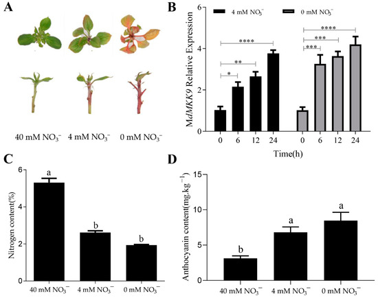 The phenotype, nitrogen content, anthocyanin content, and relative expression level of the MdMKK9 gene in ‘Daihong’ tissue culture seedlings grown in culture mediums with different nitrogen concentrations. (A) Phenotype. (B) Relative expression levels of MdMKK9. The relative level of MdMKK9 in ‘Dahong’ tissue culture seedlings at 0 h was set to 1. Asterisks indicate statistically significant differences (* p < 0.05; ** p < 0.01; *** p < 0.001; **** p < 0.0001). (C) Nitrogen content. (D) Anthocyanin content. In (C,D), different letters above the bars indicate significant differences (p < 0.05). The bars represent means ± SD (n = 3).