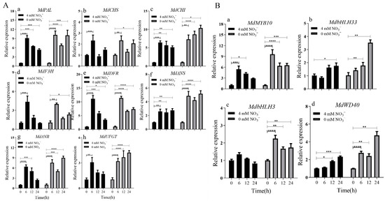 In this case, qRT-PCR was used to detect the relative expression level of structural genes related to anthocyanin synthesis—including MdPAL, MdCHS, MdCHI, MdF3H, MdDFR, MdANS, MdANR and MdUFGT—in tissue culture seedlings grown in mediums with 4 and 0 mM NO3− for 24 h. The time taken to reach the maximum expression level differed between genes and culture mediums (Figure 4). The expression levels of all genes were highest at 6 h in the 4 mM NO3− medium (Figure 4A), whereas the expression levels of MdCHI, MdANR and MdUFGT were highest at 24 h. In the 0 mM NO3− medium, the expression levels of MdCHS, MdF3H and MdDFR were highest at 6 h in the 0 mM NO3− medium. The expression levels of regulatory genes (MYB10, MdbHLH3, MdbHLH33, and MdWD40) were higher in the 0 mM NO3− medium than in the 4 mM NO3− medium. The expression levels of MdMYB10 and MdbHLH3 were highest at 6 h in both mediums, whereas those of MdbHLH33 and MdWD40 were highest at 24 h (Figure 4B).
