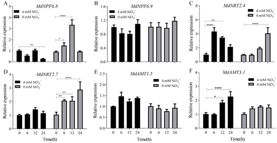 Relative expression of nitrogen transport-related genes in tissue cultured seedlings of ‘Daihong’ cultured in mediums with 4 and 0 mM NO3−. (A). MdNPF6.8, (B). MdNPF6.9, (C). MdNRT2.4, (D) MdNRT2.7, (E) MdAMT1.5, (F) MdNMT3.1. The relative level of nitrogen transport-related genes in ‘Dahong’ tissue culture seedlings at 0 h was set to 1. The bars represent means ± SD (n = 3). Asterisks indicate statistically significant differences (* p < 0.05; ** p < 0.01; **** p < 0.0001).