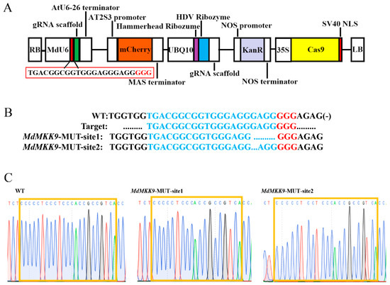 Mutagenesis of the MdMKK9 gene based on the CRISPR/Cas9 system. (A) Expression cassette of the gene-editing vector derived from pHDE-35S-Cas9-mCherry-UBQ. The red box indicates the target site. (B) MdMKK9 mutations resulting from four positive lines of gene editing. WT, wild-type. MdMKK9-MUT-site1 and MdMKK9-MUT-site2 represent two different clones. The blue dots indicate the missing bases. Red letters indicate the protospacer adjacent motifs. (C) Sequencing chromatogram of partial genomic DNA of MdMKK9 corresponding to the mutations. The orange frames indicate target sites for gene editing.