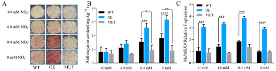 The calli of WT, OE, and MUT lines were cultured on mediums with 40, 4, 0.4, and 0 mM NO3− for 5 d at 16 °C under dark conditions. The OE calli began to appear slightly red at 4 mM NO3−, and the red phenotype gradually deepened with decreasing nitrogen concentration of the medium. The WT calli started to appear red at 0.4 mM NO3−, and the MUT lines exhibited a red phenotype at 0 mM NO3−. The anthocyanin contents of WT and OE calli increased with decreasing nitrogen concentration the medium, and there were significant differences within and across culture conditions. The anthocyanin contents of MUT calli did not differ significantly between culture conditions with different nitrogen concentration (Figure 7B). The relative expression levels of the MdMKK9 gene are shown in Figure 7C. In all four nitrogen concentrations, the expression levels of MdMKK9 were significantly higher in OE calli than in WT calli and MUT calli. However, there were no significant differences between WT calli and MUT calli.