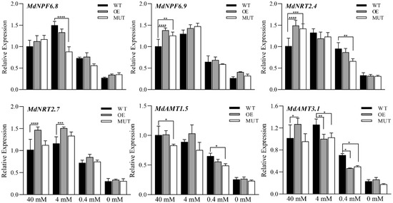 Expression levels of nitrogen regulatory genes in the calli of wild-type (WT) plants, transformed CRISPR/Cas9-MdMKK9 (MUT) lines, and transformed pRI101-MdMKK9 (OE) lines grown in mediums with different nitrogen concentrations. The relative level of nitrogen transport-related genes in 40 mM NO3− treated WT calli was set to 1. The bars represent means ± SD (n = 3). Asterisks indicate statistically significant differences (* p < 0.05; ** p < 0.01; *** p < 0.001; **** p < 0.0001).
