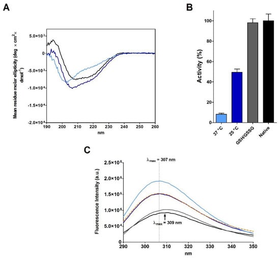 - Gambardella, G.; Cattani, G.; Bocedi, A.; Ricci, G. New Factors Enhancing the Reactivity of Cysteines in Molten Globule-Like Structures. Int. J. Mol. Sci. 2020, 21, 6949. [Google Scholar] [CrossRef]