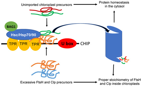 CHIP-mediated chloroplast protein quality control. Molecular chaperones Hsc/Hsp70/90 recognize unimported chloroplast precursors and can switch their role to facilitate protein degradation upon binding the PTR domain of CHIP. CHIP can also directly recognize some chloroplast precursors such as excessive FtsH and Clp precursors. CHIP mediates the ubiquitination in these unwanted or excessive chloroplast precursors and targets their degradation by the 26S proteasome. CHIP-mediated degradation of unimported chloroplast precursor proteins prevents the accumulation of misfolded proteins and helps maintain protein homeostasis in the cytosol. The degradation of excessive FtsH and Clp protein subunits may help maintain proper stoichiometry of these protease complexes inside chloroplasts.