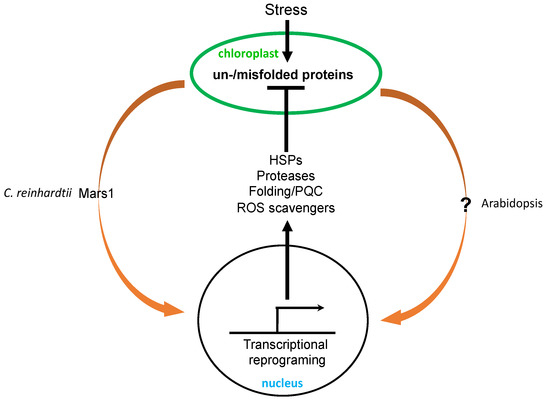 The first component involved in cpUPR signaling in the algae C. reinhardtii was reported less than three years ago [100]. The signaling component Mars1 (mutant affecting in chloroplast-to-nucleus retrograde signaling 1) was identified through a genetic screen using a florescent reporter of a cpUPR-induced gene. Mars1 is a cytoplasmic protein kinase with a critical role in the activation of cpUPR, including the induction of cp-UPR-responsive genes, and its kinase activity is required for this role [100] (Figure 3). The mutant is highly susceptible to high light levels and ROS, both of which damage proteins inside the chloroplasts and can trigger cpUPR. By contrast, mutant algae expressing a dominant active version of the Mars1 kinase protein displayed increased tolerance to both high light levels and ROS [100]. These findings not only support the critical role of chloroplast-to-nucleus retrograde signaling in the activation of cpUPR for the protection of chloroplast functions, but also open a potential avenue to improve photosynthetic efficiency under stress conditions through the exploitation of cpUPR [22].