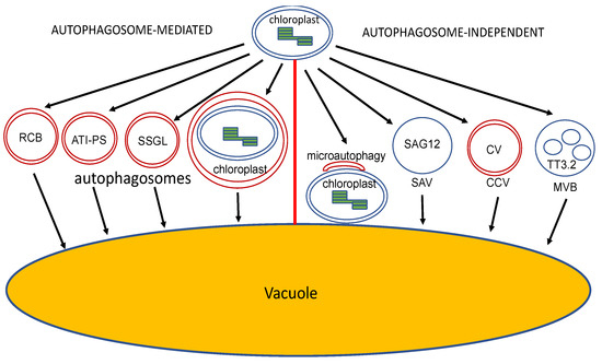 While autophagosome-dependent degradation of cytoplasmic constituents (also called macroautophagy) has been well established in chloroplast protein quality control and turnover, there are several autophagosome-independent pathways that also mediate delivery of chloroplast content to the vacuole for degradation. These pathways include microautophagy [125,126], senescence-associated vacuoles (SAVs) [127], chloroplast vesiculation (CV)-containing vesicles (CCVs) [128], and MVBs [129] (Figure 4).
