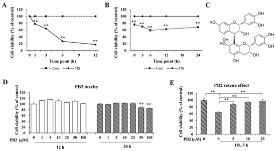 Effect of HS and PB2 on MAC-T cell viability. (A) Cell viability was measured in MAC-T cells that were treated with HS (42 °C for the indicated time periods) and then recovered at 37 °C for 6 h. (B) Cell viability was measured in cells treated with HS at 42 °C for 3 h and then recovered at 37 °C for the indicated time periods. (C) Chemical structure of PB2. (D) Cell viability was measured in cells treated with indicated concentrations of PB2 for 12 or 24 h. (E) Cells were pretreated with the indicated concentrations of PB2 for 24 h, followed by HS treatment at 42 °C for 3 h and recovery at 37 °C for 6 h. Then, cell viability was determined. n ≥ 5. ** p < 0.01.
