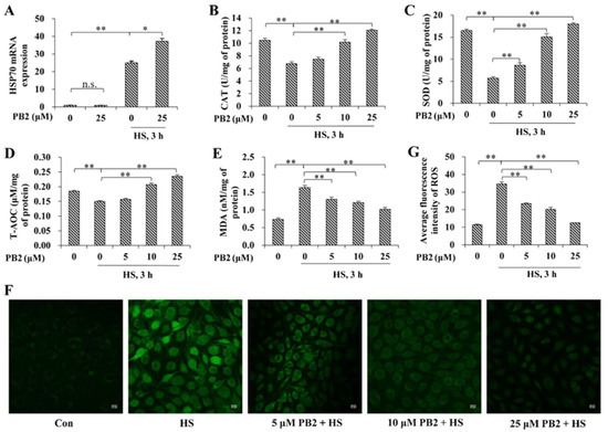 Effect of PB2 and HS on oxidative stress of MAC-T cells. (A) MAC-T cells were pre-incubated with or without 25 μM PB2 for 24 h, followed by HS treatment at 42 °C for 3 h and recovery at 37 °C for 6 h. Then, cells were collected to detect HSP70 mRNA expressions (n = 3). Additionally, MAC-T cells were pre-incubated with indicated concentrations of PB2 for 24 h, followed by HS treatment at 42 °C for 3 h and recovery at 37 °C for 6 h. Then, the cells were analyzed for: (B) the catalase (CAT) activity; (C) the superoxide dismutase (SOD) activity; (D) the total antioxidant capacity (T-AOC) activity; and (E) the malondialdehyde (MDA) content. (F) Images of the MAC-T cells stained with DCFH-DA were captured by a laser scanning confocal microscope, followed by relative florescence intensity assay (G). n ≥ 6. Scale bar: 50 μm. * p < 0.05, ** p < 0.01, n.s. p > 0.05.