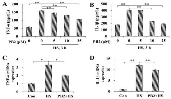 As shown in Figure 3A,B, the release of pro-inflammatory cytokines, including TNF-α and IL-1β, were increased after HS treatment (p < 0.01); pretreatment with 5, 10, and 25 μM PB2 significantly decreased their release in a dose-dependent manner (p < 0.01), except 5 μM PB2 pretreatment on IL-1β (p > 0.05). Consistently, mRNA expressions of TNF-α (p < 0.05) and IL-1β (p < 0.01) were enhanced by HS treatment; pretreatment with 25 μM PB2 significantly alleviated the mRNA expressions of TNF-α (p < 0.05) and IL-1β (p < 0.01; Figure 3C,D).