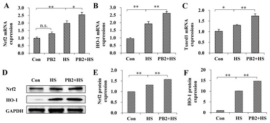 Effect of PB2 and HS on Nrf2 pathway activation of MAC-T cells. MAC-T cells were pretreated with or without 25 μM PB2 for 24 h, followed by HS treatment for 3 h, and then recovered for another 6 h. Then, cells were collected for mRNA and protein expression test. (A) Nrf2 mRNA level. (B) HO-1 mRNA level. (C) Txnrd1 mRNA level. (D–F) Protein expressions of Nrf2 and HO-1. n = 3. * p < 0.05, ** p < 0.01, n.s. p > 0.05.
