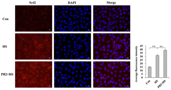 In addition, immunofluorescence confocal microscopy analysis show HS treatment stimulated Nrf2 nuclear translocation in MAC-T cells (p < 0.01), and 25 μM PB2 pretreatment further promoted the nuclear translocation of Nrf2 (p < 0.01; Figure 5).