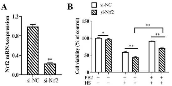In order to explore functions of the Nrf2 signaling pathway in PB2 protective effects on HS-induced cell damage, siRNA-mediated Nrf2 gene silencing was carried out in the following experiments. As shown in Figure 6A, compared with the control (si-NC) group, transfection of si-Nrf2 significantly reduced 76% of Nrf2 mRNA levels (p < 0.01), indicating si-Nrf2 could be used in this experiment. Compared with the si-NC group, the transfection of si-Nrf2 significantly reduced cell viability under the normal culture condition of 37 °C (p < 0.05), the 42 °C HS condition (p < 0.01), as well as the PB2 + HS condition (p < 0.01; Figure 6B). However, comparing with si-Nrf2 + HS groups, 25 μM PB2 pretreatment still significantly enhanced cell viability (p < 0.01). These results suggest Nrf2 played a mild negative role on cell viability, and the PB2 protective effect on HS-induced cell viability loss was partly through the Nrf2 signaling pathway.
