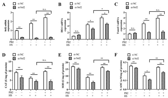 Effect of Nrf2 knockdown on oxidative stress in MAC-T cells. MAC-T cells were transfected with si-Nrf2 or si-NC for 12 h, and then incubated with/without 25 μM PB2 for 24 h, followed by HS treatment for 3 h and recovery for 6 h. Then, the cells were analyzed for (A) Nrf2 mRNA, (B) HO-1 mRNA, and (C) Txnrd1 mRNA levels. n = 3. Additionally, (D) the catalase (CAT) activity, (E) the superoxide dismutase (SOD) activity, and (F) the total antioxidant capacity (T-AOC) activity were detected. n ≥ 6. * p < 0.05, ** p < 0.01, n.s. p > 0.05.