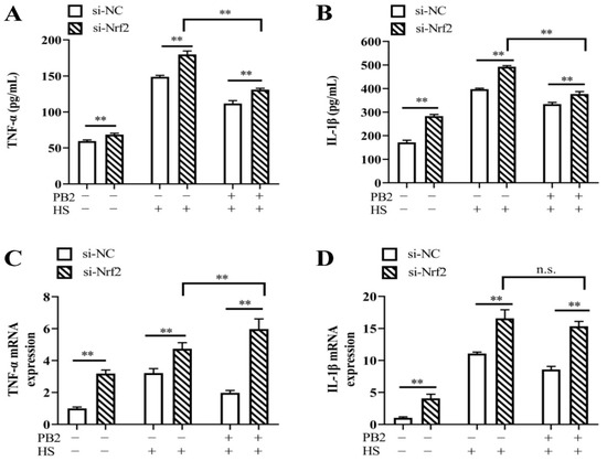 Effect of Nrf2 knockdown on release and gene expression of pro-inflammatory cytokines. MAC-T cells were transfected with si-Nrf2 or si-NC for 12 h, and then incubated with/without 25 μM PB2 for 24 h, followed by HS treatment for 3 h and recovery for 6 h. Then, the culture media were used to investigate the release of (A) TNF-α and (B) IL-1β, and cells were harvested to test (C) TNF-α and (D) IL-1β mRNA expression levels. n = 3. ** p < 0.01, n.s. p > 0.05.