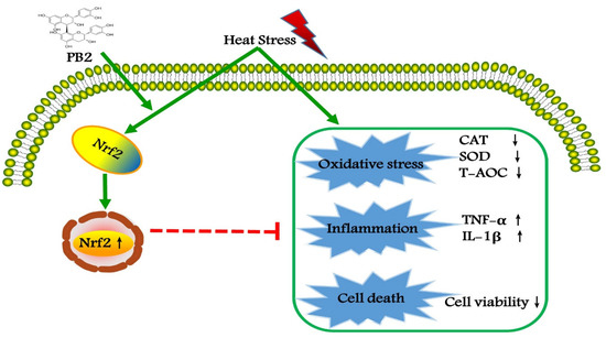 Taken together, HS stimulation induces oxidative stress and inflammation in MAC-T cells, resulting in significant impairment of cell viability. Preconditioning of PB2 can significantly improve the antioxidant defense ability of cells, partly through the Nrf2 signaling pathway, in order to alleviate the damage of HS to cells (Figure 9). These results provide functional evidence for PB2 as a new natural antioxidant to protect mammary epithelial cells from hyperthermia-induced damage. In vivo studies concerning PB2 supplementation in dairy cows in summer deserve further study.
