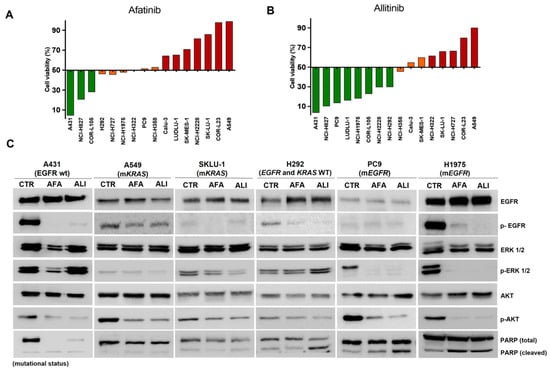 The comparative effect between afatinib and allitinib. The growth inhibition score (GI) of NSCLC cells was calculated for afatinib (A) and allitinib (B) at 1000 nM, classified as highly sensitive-HS (green bars), moderate sensitivity-MS (orange bars), and resistant-R (red bars). (C) Western blot analysis of EGFR, ERK, and AKT total or phosphorylated and cleaved PARP. EGF ligand was used at 10 ng/mL for 10 min. CTR: control; AFA: afatinib, ALI: allitinib at 0.2 μM.