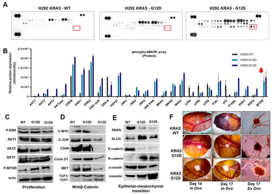 Molecular alterations in KRAS mutated cell lines. Representative pictures of phospho-RTK arrays for H292 KRAS wild-type, KRAS (G12D), and KRAS (G12S) cell lines (A). Each RTK is duplicate in the arrays (two spots side by side) and four pairs of phosphotyrosine positive controls in the corners of each array. Densitometric analyses are represented by bar graphs and red arrow show mTOR in KRAS mutated cells. Red squares show the mTOR phosphorylated levels (B). Analysis of proliferation markers (C), Wnt/β-catenin (D), and epithelial–mesenchymal transition (E) markers by Western blot. In vivo effect of KRAS mutations on H292 cell line growth (F). Representative pictures (×16 magnification) of CAM assay in ovo and ex ovo at 14 and 17 days. Data presented as a mean of 18 eggs per group.