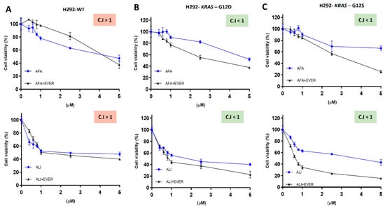 Cell viability assay of wild-type-WT (A) KRAS mutated cell G12D (B) and KRAS mutated cell G12S (C) exposed to EGFR inhibitors in combination with everolimus (1 μM) for 72 h. Squares represent combination index (CI) values. Synergy (CI < 1.0); antagonism (CI > 1.0); and additivity (CI = 1.0). AFA: afatinib, ALI: allitinib, EVER: everolimus. Data presented as the mean of three independent experiments.