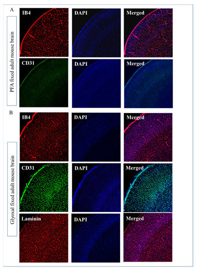 To visualize blood vessels, immunohistochemical techniques targeting endothelial markers such as cluster of differentiation (CD) 31 [26,27], basement membrane markers including laminin [28] and lectins that bind to the luminal part of the capillary endothelium through interactions with sugar residues [29] have been widely used. Prior reports [30,31,32] and from our lab experience, immunohistochemical vascular staining methods with 4% PFA fixed sections as well as a lower PFA (2%) concentration (results not shown) did not provide consistent results (Figure 2). Also, from our experiments and as reported before, even IB4 staining is not consistent in PFA fixed sections [33]. Intriguingly, glyoxal fixed brain shows staining for all of the three-vessel markers (Figure 2). Thus, glyoxal fixation of the brain can be recommended as an ideal approach for learning any structural brain vascular abnormalities.