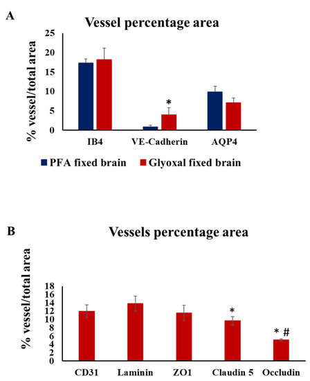 Quantitative analysis of the vascular network. (A) Angiotool analysis of percentage vessel area in PFA fixed brain versus glyoxal fixed brain, based on immunofluorescence after staining for vascular markers (IB4-isolectin, VE-cadherin and Aquaporin) and graphical representation of the analysis performed on three different regions of interests. The data shown represent the mean ± SD; statistical analysis was performed with unpaired t-test; n = 3. * p < 0.05 PFA fixed brain sample versus glyoxal fixed brain samples. (B) Angiotool analysis of percentage vessel area in glyoxal fixed brain, based on immunofluorescence after staining for vascular markers (CD31, Laminin, ZO-1, Claudin-5, and Occludin) and graphical representation of the analysis performed on three different regions of interest. ANOVA and a post hoc Tukey’s test were performed between groups for finding the statistical significance. A value of p < 0.05 was considered statistically significant. * p < 0.05 compared to laminin. # p < 0.05 compared to CD31.