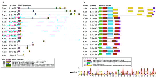 Conserved sequence motifs (colored boxes) identified by MEME in the second (a) and third introns (b) of pIgR from Trematomus bernacchii (T.ber), Gymnodraco acuticeps (G.act), Pseudochaennichthys georgianus (P.geo), Cottoperca gobio (C.gob), Sander lucioperca (S.luc), Perca fluviatilis (P.flu), Perca flavesvens (P.fla), Etheostoma spectabile (E.spe), Etheostoma cragini (E.cra), Epinephelus lanceolatus (E.lan), Plectropomus leopardus (P.leo), Sebastes umbrosus (S.umb), Pungitius pungitius (P.pun), Anarrhichthys ocellatus (A.oce), and Gasterosteus aculeatus (G.acl). The WebLogo representation of motif 5.3 (ocher box) is reported at the bottom of panel (b).