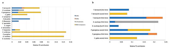To elucidate other reasons to account for the presence of the very long intronic regions of pIgR in T. bernacchii and in the other Antarctic species, we searched for transposable elements (TEs), which are known to cause genome modifications. A systemic analysis of the distribution of TE elements in each intron in all Perciformes indicated that the second intron in T. bernacchii was characterized by the presence of one type of TE (Figure 2a), while the third intron appeared to be more heterogeneous due to the presence of SINEs and LINEs, the same as found in P. georgianus, or similarly to G. acuticeps, which showed LINEs and LTR elements (Figure 2b). Moreover, only the second intron of the C. gobio pIgR gene was characterized by the presence of DNA transposons, like the T. bernacchii second intron (Figure 2a).