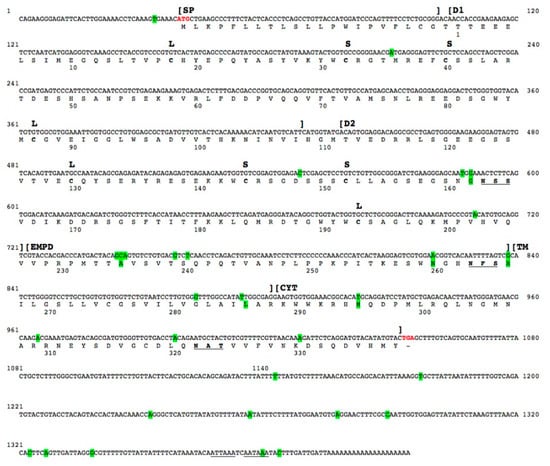 Nucleotide and deduced amino acid sequences of the gene encoding T. bernacchii pIgR. The start and stop codons are given in bold red, and the polyadenylation signals located downstream of the stop codon are underlined. The boundaries of the signal peptide (SP); the D1, D2, and EMPD domains; and the transmembrane (TM) and cytoplasmic (CYT) regions are indicated by square brackets above the nucleotide sequence. Polymorphic sites are highlighted in green. Amino acid residues are reported in one-letter code below the nucleotide sequence. The large (L) and the small (S) loops are indicated above codons for the cysteine residues forming them. N-glycosylation sites defined by the NXS/T sequons are bold and underlined. The numbering of nucleotides and of amino acids residues is reported above and below each sequence, respectively.