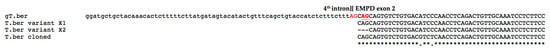 Alignment of the T. bernacchii pIgR genomic sequence with that of the three transcript variants. Of the pIgR genomic sequence (gT.ber), retrieved from the T. bernacchii genome, only the region spanning the 3′ end of the fourth intron and the 5′ end of the EMPD exon 2 is shown. Two pIgR variants (T.ber variant X1 and T.ber variant X2) are predicted from the genome; the pIgR cDNA variant (T.ber cloned) has been isolated in the present study. The canonical acceptor splicing site is depicted in red. The cryptic splicing site is in bold red and underlined. Gaps are indicated by dashes. Identical nucleotides are indicated with an asterisk below the alignment; positions differing in one nucleotide are marked by dots.
