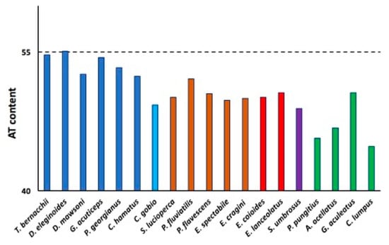 As previously shown by the AT content analysis of notothenioid IgT genes [21], a remarkably high AT content of pIgR exons was shared within Antarctic species, reaching a peak (55.8%) in the Nototheniidae family, which comprises T. bernacchii and Dissostichus eleginoides (Figure 7). This finding reflects a peculiar feature not shared with either the non-Antarctic species C. gobio, their closest relative, or all the other Perciformes.