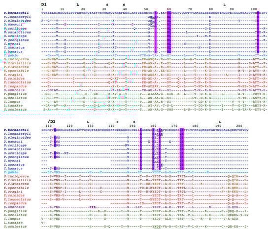 Multiple amino acid sequence alignments of pIgR D1–D2 domains from Notothenioidei (in blue; T. bernacchii in bold blue, and C. gobio in bold light blue) and other species of the perciform suborders Percoidei (in brown), Serranoidei (in red), Scorpaenoidei (in purple), and Cottoidei (in green). Antarctic-notothenioid-specific residues are reported in bold and highlighted in magenta. The highly conserved cysteine residues, characteristic of the immunoglobulin fold, are in bold. The large (L) and the small (S) loops are indicated above the cysteine residues forming them. Putative N-glycosylation sites are in bold and underlined. Amino acid residues that are identical to those shown in the sequence of T. bernacchii are indicated by dashes. Gaps are indicated by dots. The complete alignment is shown in Figure S3.